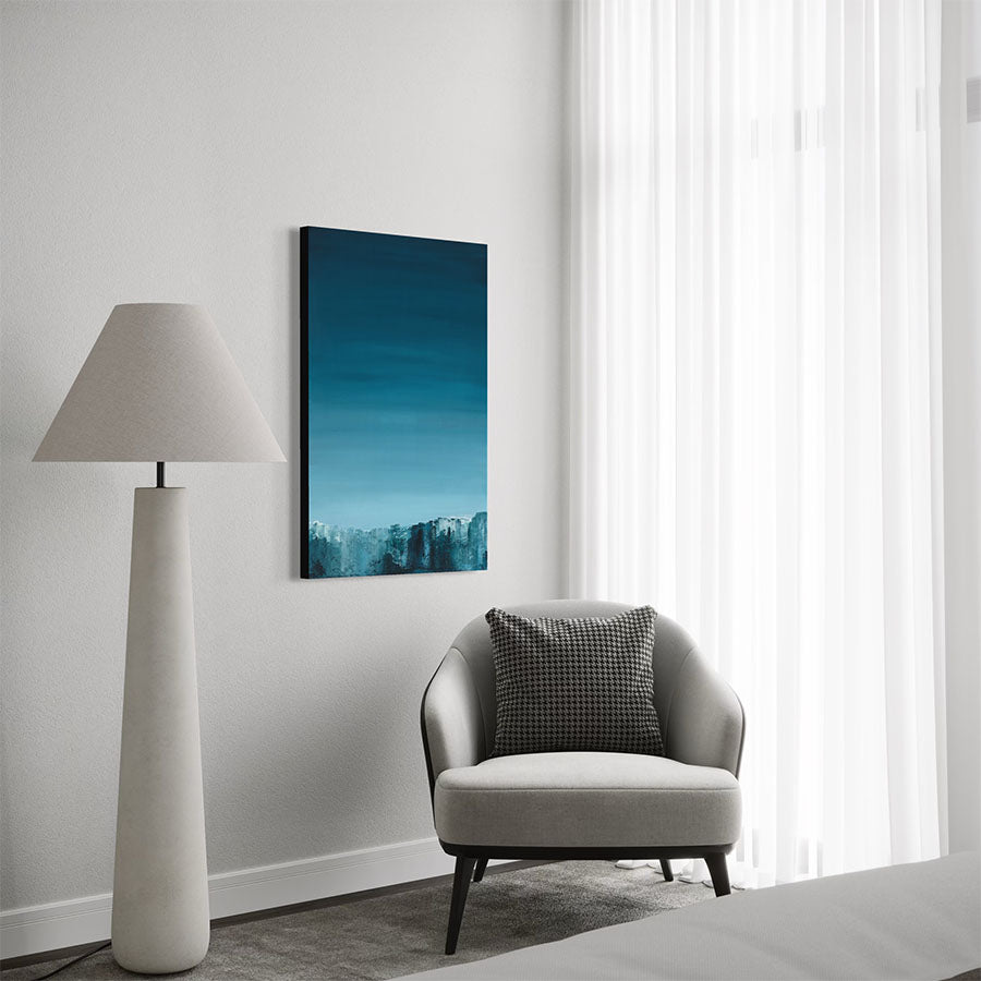 Dominated by a deep tonal turquoise palette, the cliffs rise in immense, sculptural forms - yet they are visually humbled by the sky that looms above. The tonal contrast is both subtle and dramatic - dense shadows within the cliffs seem to absorb all light, while the sky, though expansive, radiates a muted luminosity in cool, tonal turquoise.