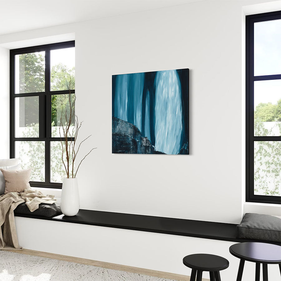 Chromatic layers give depth to the cascading water and surrounding rock, shifting from luminous whites to chromatic deep hues. The atmosphere hums with energy, yet holds an unexpected stillness - the kind found only in moments of raw, natural magnitude.